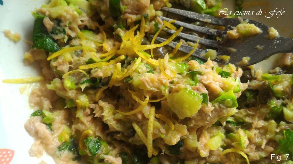 Cozinhe por mais 3′. Pimenta e ajuste o sal se necessário. Enquanto isso, em uma tigela, misture os filés de atum bem escorridos com o ovo, o queijo parmesão ralado e as ervas aromáticas picadas (fig. 5).