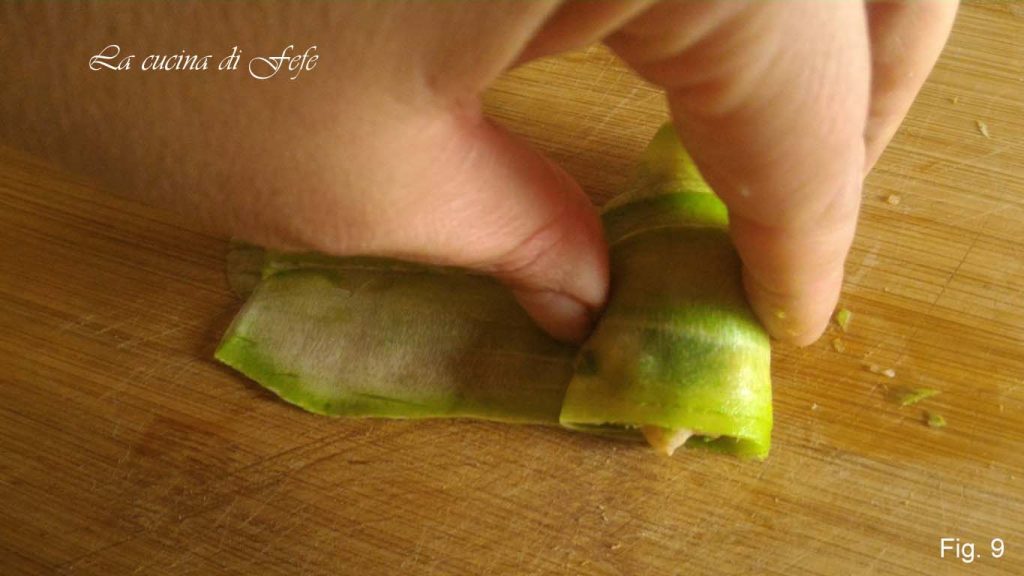 Pegue 2-3 tiras de abobrinha, sobreponha-as em uma tábua e distribua um pouco desse composto em uma extremidade (fig. 8).