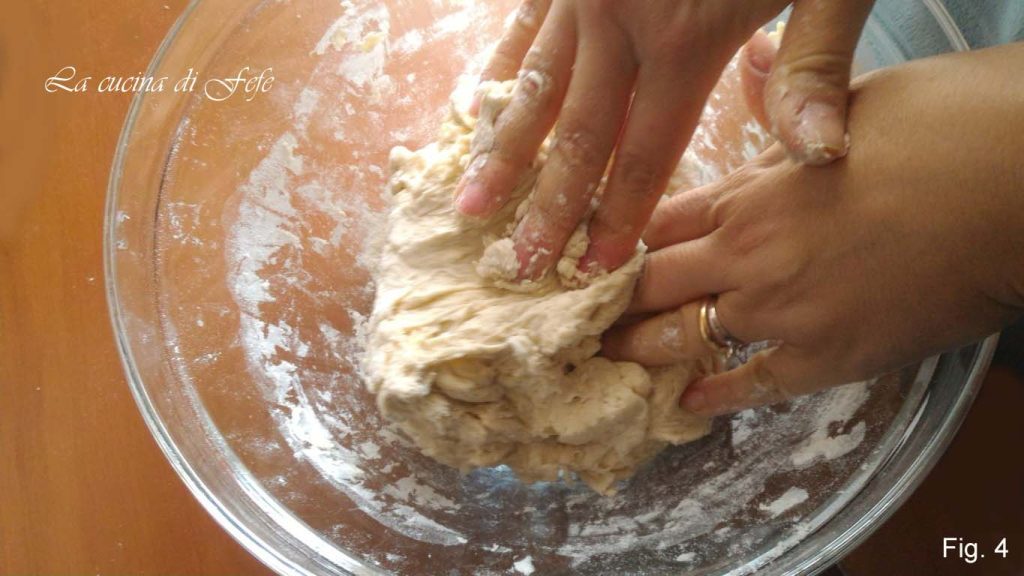 Disponha a massa sobre a superfície enfarinhada, abra com as mãos; dobre sobre si mesma em direção ao centro como se fosse uma folha: primeiro as abas superior e inferior, depois as laterais. Assim você obterá novamente um pão redondo. Essa operação é necessária para melhorar a estrutura do pão.