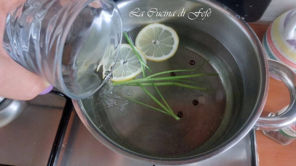 • Encha pela metade uma panela com água, adicione sal levemente e aromatize com fatias de limão, alguns talos de salsinha, bagas de zimbro e o vinho branco