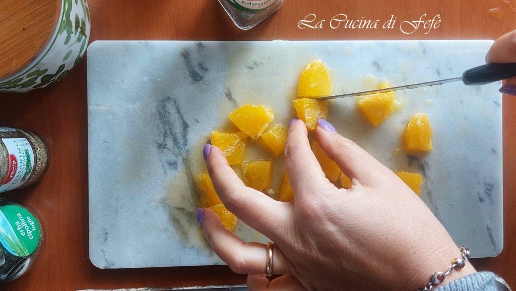 • Enquanto isso, descasque uma laranja grande, cortando primeiro as duas extremidades e depois a casca de cima para baixo. É importante nesta operação que a pele branca também seja removida durante o corte.
