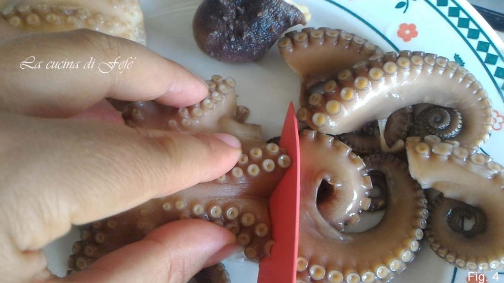 • Escorra o polvo, divida-o ao meio e corte-o em pedaços, incluindo a cabeça (fig. 4).