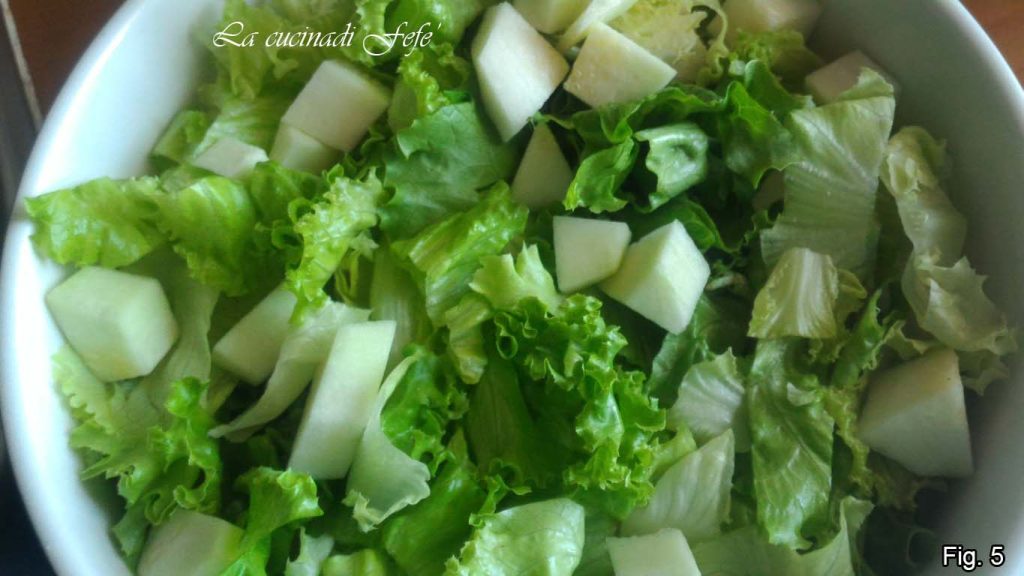 Em uma saladeira grande, disponha o coração da alface cortado em julienne, em seguida, adicione os cubos de pepino.