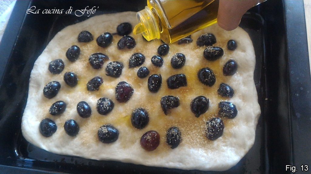 Distribua metade das uvas cortadas ao meio, polvilhando com metade do açúcar mascavo e regando com um fio de azeite (fig. 13).