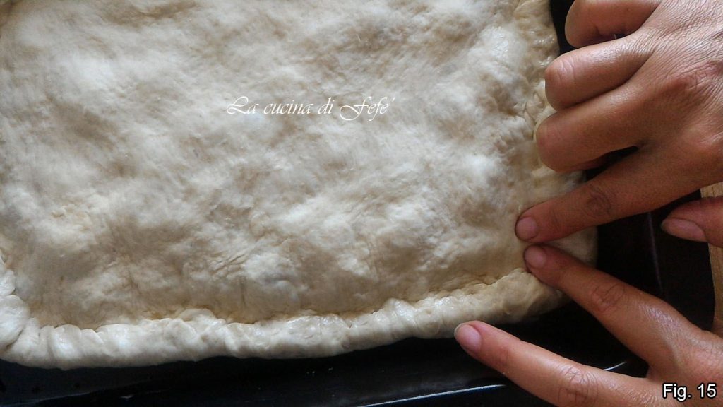 Coloque-o sobre a base da focaccia até que as bordas adiram uma à outra, então sele puxando a borda da focaccia de baixo para cima e apertando com a de cima (fig. 15).