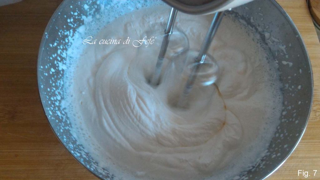 À parte, com a batedeira elétrica, bata os restantes 250 ml. de chantilly já adoçado. Se você comprou o chantilly fresco, adicione 20 g de açúcar de confeiteiro.