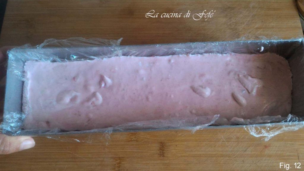 Misture bem e despeje a mistura obtida em uma forma para freezer forrada com filme plástico para alimentos. Nivele tudo com a ajuda de uma espátula.