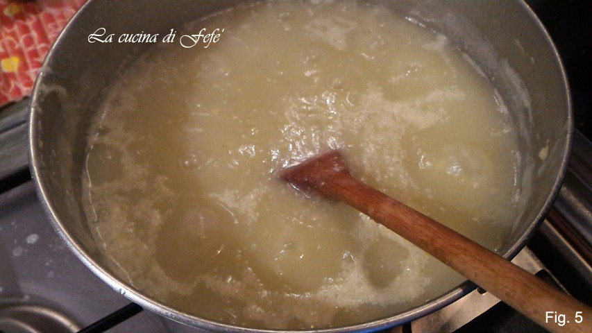 Cozinhe a partir da fervura por cerca de 25 minutos, adicionando mais caldo apenas se necessário e um pouco de gengibre ralado. Os funchos devem ficar bem macios. Desligue o fogo, ajuste o sal, elimine o excesso de caldo, mas sem descartá-lo, depois deixe esfriar um pouco e bata com um mixer (fig. 4).
