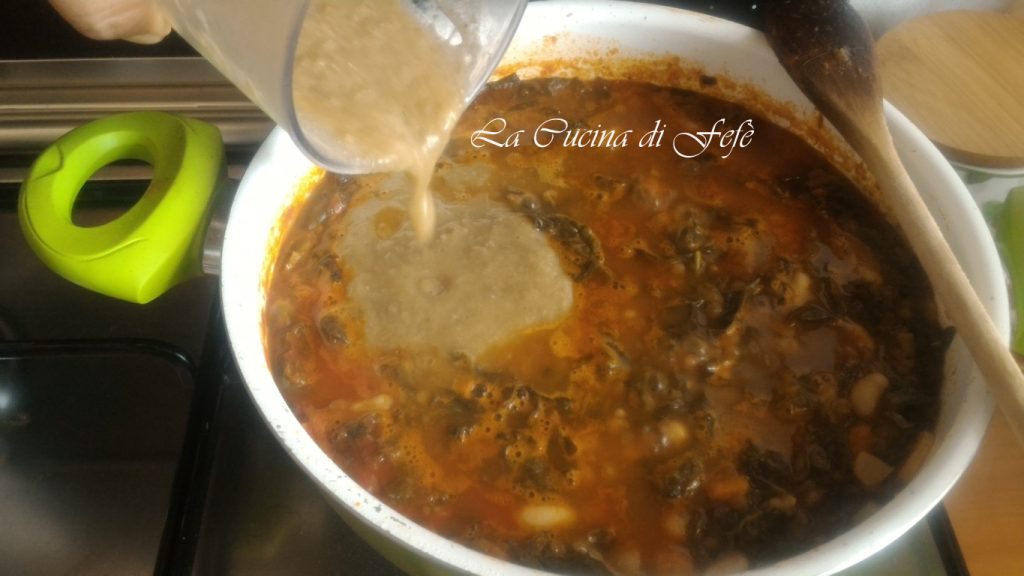 Adicione a outra metade da couve negra e refogue cobrindo com uma tampa em fogo baixo por alguns minutos, adicionando algumas conchas de caldo quente conforme necessário.