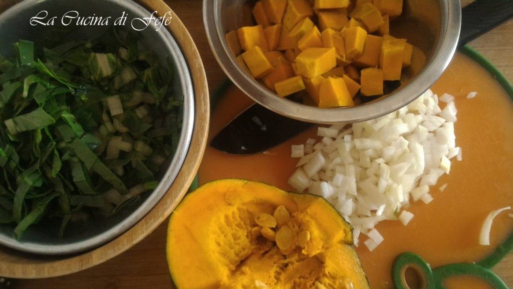 • Neste ponto, adicione também os cubos de abóbora, cubra com 3 conchas de caldo e deixe cozinhar em fogo brando por mais 2′