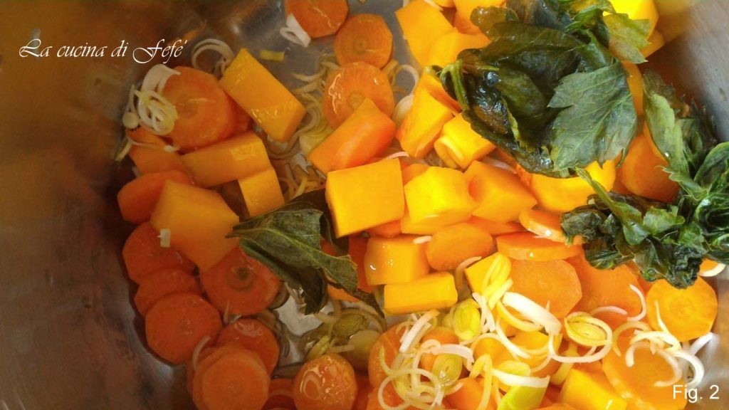 Comece cortando as cenouras em rodelas, a abóbora em cubos, a parte branca do alho-poró, reservando também a parte verde (fig. 1).