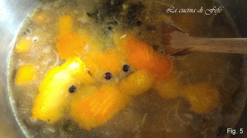 Adicione algumas cascas de laranja, os cravos-da-índia e as bagas de zimbro, cozinhe em fogo baixo por cerca de 30′ (fig. 5).
