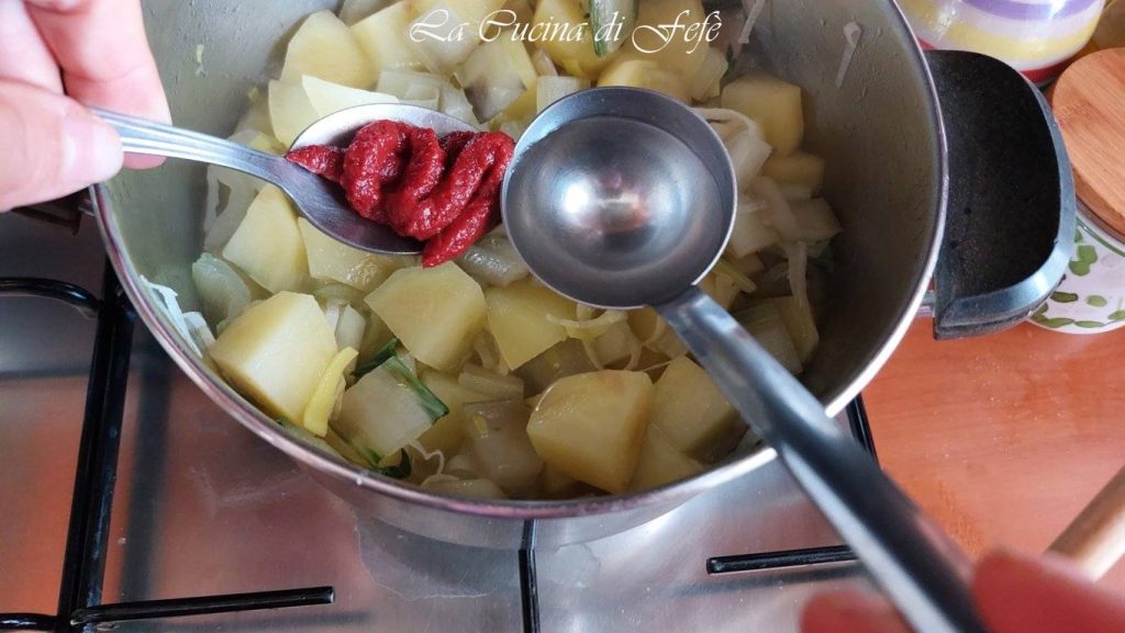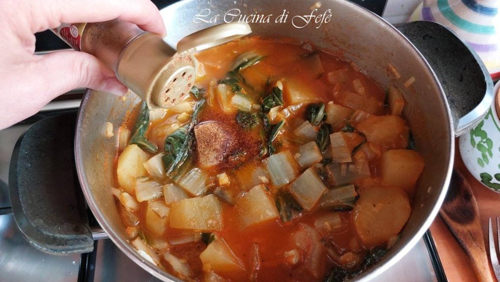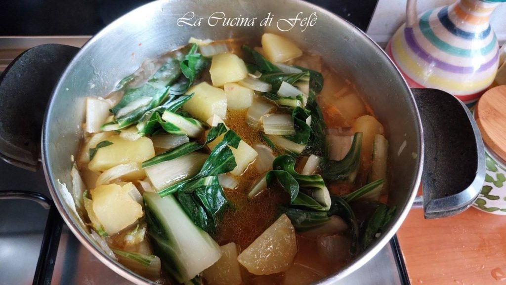 • Adicione então os talos e as batatas cortadas em cubos e deixe dourar em fogo vivo por cerca de 5′, mexendo com frequência.