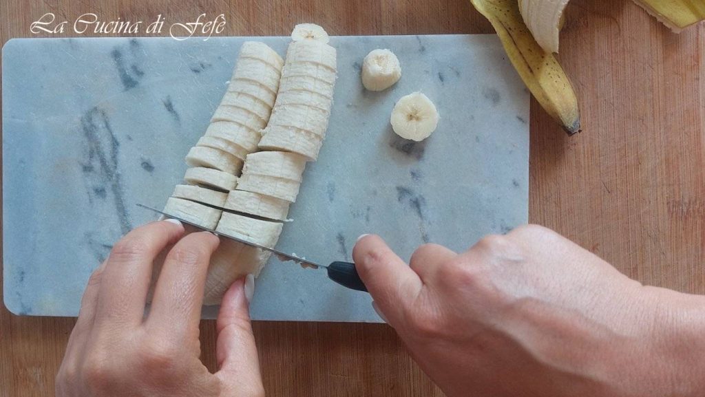 Para conveniência, recomendo que você prepare a fase de congelamento da fruta na noite anterior, mas 8 horas são suficientes. Proceda assim: descasque as bananas que devem estar bem maduras.
