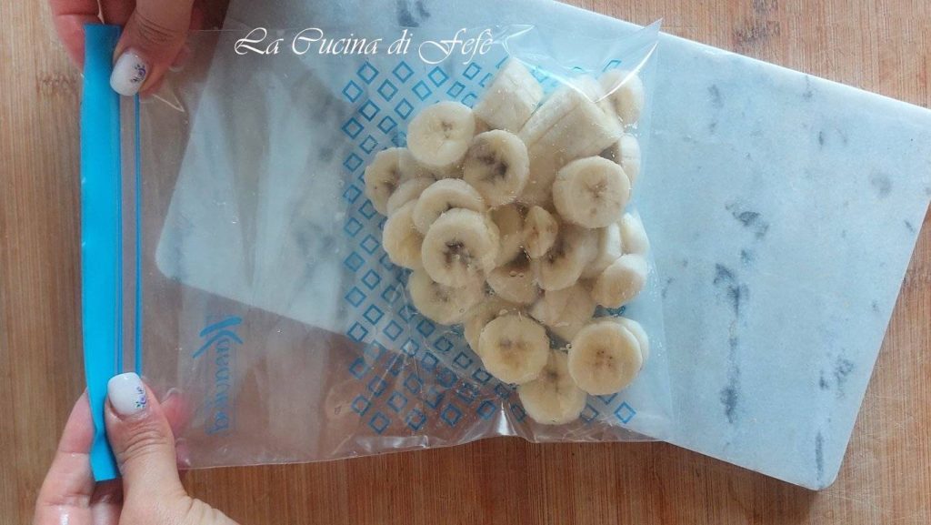 Transfira as rodelas de banana para um saco de alimentos adequado para congelamento e sele-o. Coloque o saco no freezer por pelo menos 8 horas, mas seria melhor a noite toda.