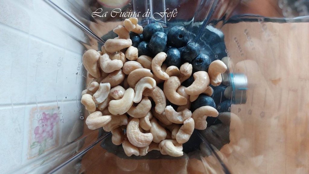 • Passado este tempo, transfira as castanhas de caju bem escorridas e já macias para o copo de um liquidificador junto com os mirtilos previamente lavados sob água corrente.