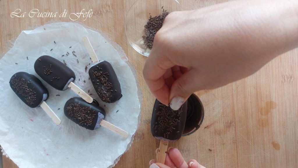 🟣** Recomendo mergulhar os sorvetinhos um de cada vez, mantendo os outros no freezer até o último momento para evitar que eles comecem facilmente a derreter durante esta fase.