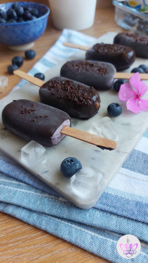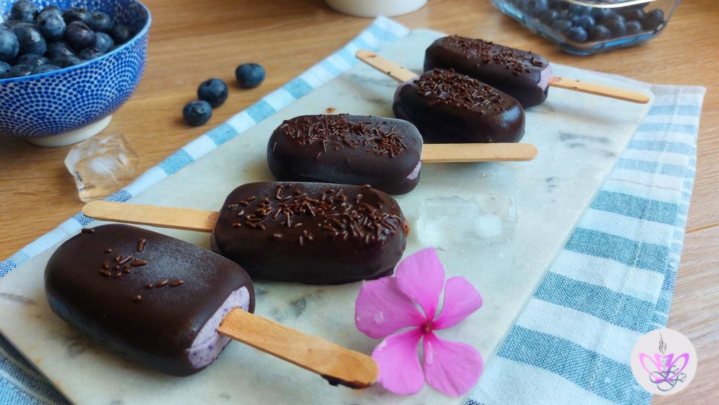 O calor já chegou há alguns dias, não acreditava que a temporada de verão começasse tão cedo! No entanto, além de beber bastante e evitar sair em horários proibitivos, nós tentamos combatê-lo com pratos frescos e leves e nos permitimos algumas guloseimas preparando sorvetes caseiros, obviamente mais saudáveis e nutritivos do que os industriais! Como você sabe, estou sempre em busca de ideias que se adequem às minhas necessidades alimentares porque aprendi a apreciar a boa comida, feita de coisas simples e genuínas, então quando vi na web esses magnums de mirto e castanhas de caju, corri para a cozinha para replicá-los já tendo todos os ingredientes à disposição! Em comparação com a proposta original, substituí o iogurte por ricota, que na minha opinião confere mais corpo e sabor no momento da degustação final, enquanto para a cobertura, em vez do chocolate branco que acho muito enjoativo, optei por um excelente chocolate amargo! Confesso que recentemente passei a apreciar o de 95%, mas para os menos audazes pode-se tranquilamente usar o de 70% ou 85% que já são ótimas escolhas! Juro, são dos melhores que experimentei até agora, e o legal é que são fáceis e rápidos de fazer! Basta ter um bom liquidificador e forminhas de sorvete, e está feito! Serão perfeitos para o lanche dos seus filhos, mas na minha opinião também como sobremesa de verão para oferecer informalmente aos amigos. Vão desaparecer rapidamente!