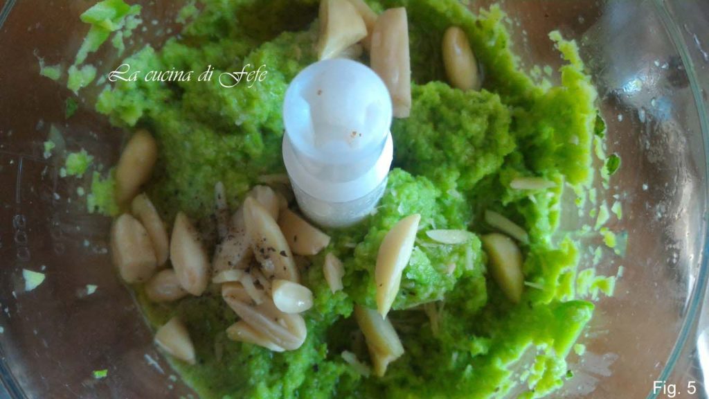 Cozinhe as tagliatelle em água fervente salgada, escorra, reservando um par de conchas. Tempere com o pesto de favas e misture bem (fig. 9).