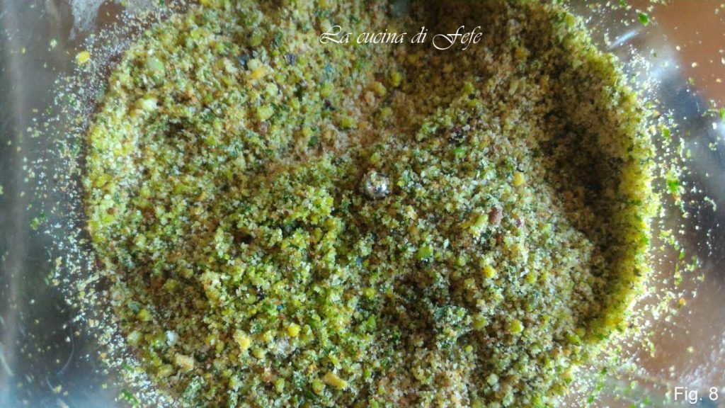 À parte, misture no copo do mixer o pão ralado com o manjericão, o pistache granulado, 2 colheres de sopa de óleo e uma pitada de sal (fig. 7).