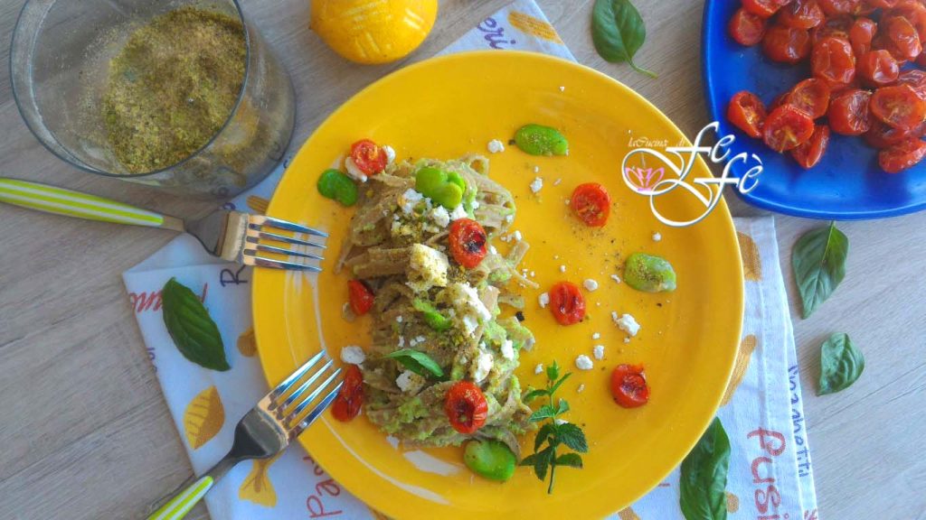 Você conhece a farinha de trigo duro Tumminia? É um dos grãos mais antigos da Sicília, onde o grão é trabalhado com mós de pedra natural. É uma farinha integral, portanto pouco processada e refinada. Além disso, apresenta um baixo teor de glúten mas um bom aporte proteico em comparação com as farinhas tradicionais. Algumas semanas atrás, se você me seguiu nas histórias do Instagram, você deve ter visto que tive o prazer de visitar Borgata Santa Rita, um pequeno distrito de Caltanissetta, um vilarejo agora habitado por pouquíssimos moradores, dedicados principalmente à agricultura e com um charme anacrônico! Lá conheci Maurizio Spinello, um padeiro, que com sua paixão pelo pão, criou um forno artesanal, capaz de oferecer a oportunidade de saborear produtos de altíssima qualidade e com certificação orgânica. Hoje, Maurizio exporta para todo o mundo e eu tive o prazer de conhecer seu amor pela Sicília, seu mundo, feito de grãos autóctones sicilianos, com moagem em pedra, e colhidos por jovens locais que acreditam e investem em nosso território! Estas tagliatelle integrais de trigo tumminia são a prova dessa genuinidade e deste compromisso. Uma vez cozidas, você terá a clara sensação de tê-las preparado você mesmo em casa. Sua capacidade de resistência durante o cozimento é absolutamente formidável, e igualmente a de reter os mais variados molhos! Hoje, tenho a honra de oferecer a você uma maneira de valorizar ao máximo um grão tão nobre. Um prato simples, mas com sabores de contraste, como o delicado pesto de favas com que são temperados e o feta grego, de sabor forte e decidido. Tudo adornado com tomatinhos assados com raspas de limão e uma farofa de pão ralado aromatizado com manjericão e pistache granulado para completar este prato realmente especial!