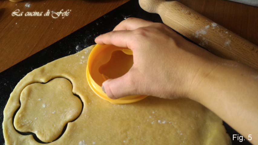 Tente obter uma espessura de cerca de 2 ou 3 mm, então corte círculos com um cortador de massa com bordas onduladas. Você pode tentar, alternativamente, cortar com a borda de um copo (fig. 5).