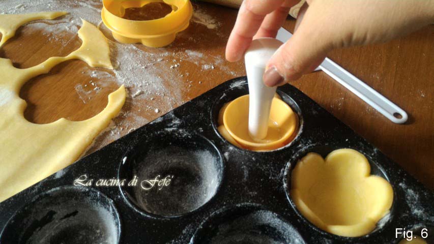Unte e enfarinhe a forma de muffin e coloque dentro de cada abertura os seus círculos, posicionando o carimbo ou o cabo de uma colher no centro e pressionando muito delicadamente para baixo até formar os seus cestos (fig. 6).