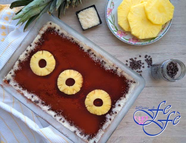Com o calor destes dias e a chegada iminente do verão, aqui na Sicília a palavra de ordem é consumir cada vez mais pratos frescos e leves! A sobremesa que proponho hoje não é exatamente o que se pode definir como um doce hipocalórico, embora seja uma variante do clássico tiramisù. No entanto, certamente o efeito de frescor no paladar será nitidamente superior à versão tradicional com café, graças à presença refrescante do abacaxi, que eu adoro. A união com o coco então, confere no conjunto uma certa doçura, atenuada, no entanto, em parte pelo cacau amargo e pela adição de gotas de chocolate entre as camadas. Um equilíbrio de sabores, na minha opinião, fora do comum para uma sobremesa de colher realmente versátil e rápida de fazer! Recomendo que experimente esta versão alternativa, pois, além de garantir um sucesso seguro em poucos e simples passos, irá surpreender você agradavelmente! Será a sobremesa perfeita para todas as suas ocasiões, prestando-se até mesmo como um doce para a Ceia de Ano Novo! E, acreditem, você fará novamente, e depois de novo, e tantas outras vezes!