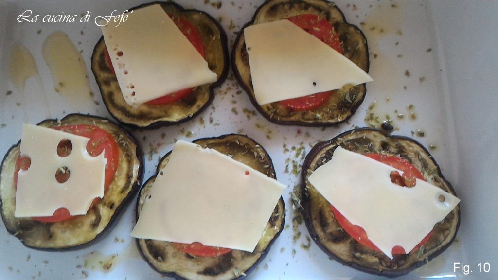 • Uma vez temperadas, sobreponha cada fatia de tomate sobre as bases de berinjela (fig. 9).
