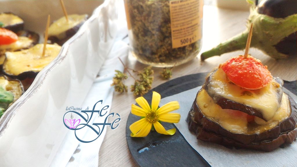 Existem dias em que a criatividade falta, especialmente quando se está com um pouco de pressa e se quer preparar algo rápido, mas ao mesmo tempo saboroso e visualmente bonito para colocar na mesa! Às vezes, navegando pela internet, eu busco inspiração para depois expressar minha criatividade com pequenas modificações nas quantidades ou no modo de preparo durante as várias etapas. Esta receita de torres de berinjela é uma daquelas que anos atrás capturou imediatamente a minha atenção! Em relação à receita original, no entanto, eu preferi adicionar uma camada a mais, aproveitando também as fatias menores de berinjela, que geralmente são descartadas. Vocês já me conhecem, não gosto de desperdício de alimentos e em casa não se joga nada fora! Aproveitando a necessidade de renovar as fotos no blog, porque as anteriores eram realmente inadequadas, eu as propus novamente com prazer para o jantar de hoje. O que dizer? Levíssimas e ao mesmo tempo deliciosas! Simplesmente temperadas com óleo, sal e orégano, transformam-se em verdadeiras delícias graças a esse toque de queijo emmental cremoso que derrete perfeitamente ao assar. Assim, elas se tornam um aperitivo finger food realmente delicioso e visualmente atraente, mas também um perfeito segundo prato totalmente vegetariano!