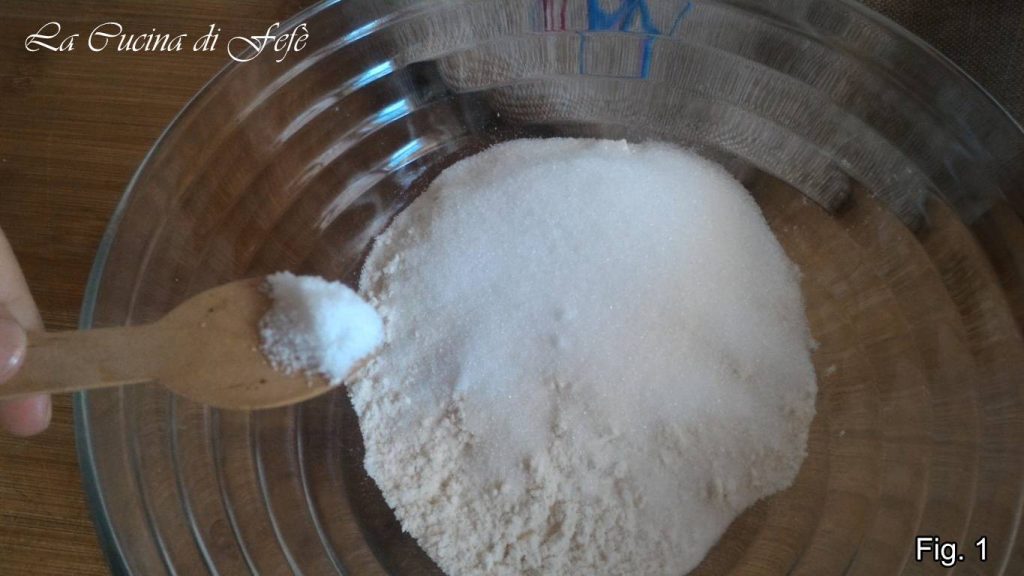 Em uma tigela, misture os pós, ou seja, o eritritol com a farinha e o fermento previamente peneirados e uma pitada de sal (fig. 1).