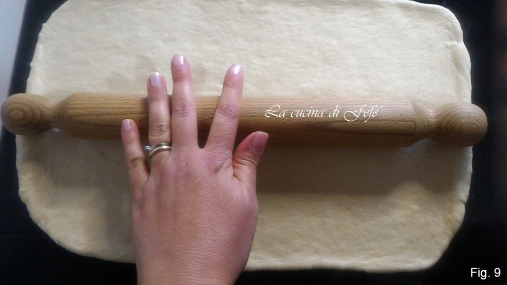 Estenda o primeiro pedaço sobre uma superfície de trabalho bem enfarinhada com a ajuda de um rolo até obter uma folha retangular de 40×27 (fig. 9).