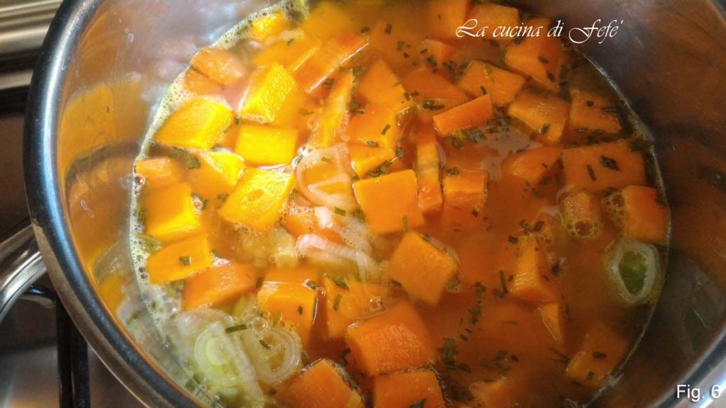 Cubra com água quente sem exagerar na quantidade. Deixe ferver, então abaixe o fogo, coloque uma tampa e cozinhe por 25 minutos ou até que a abóbora e as cenouras estejam bem macias (fig. 6).