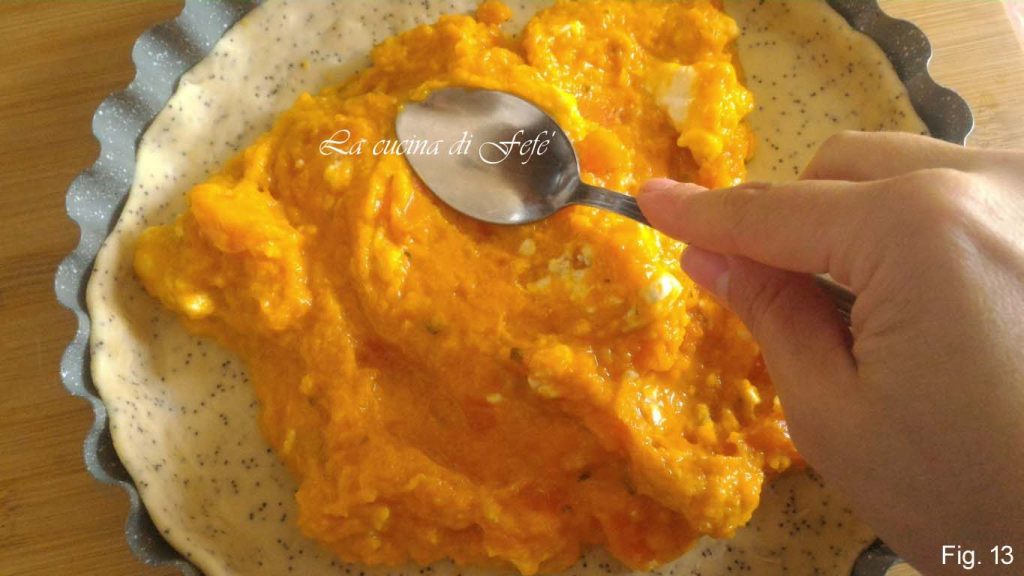 Fure o fundo com os dentes de um garfo e recheie com o creme de abóbora, distribuindo-o uniformemente com a ajuda de uma colher (fig. 13).