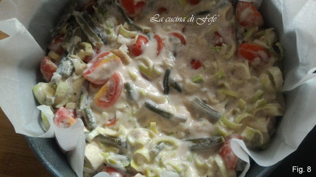 • Adicione os legumes, ou seja, o alho-poró, os tomates e as vagens previamente cozidas e cortadas ao meio no sentido do comprimento e misture bem (fig. 6).
