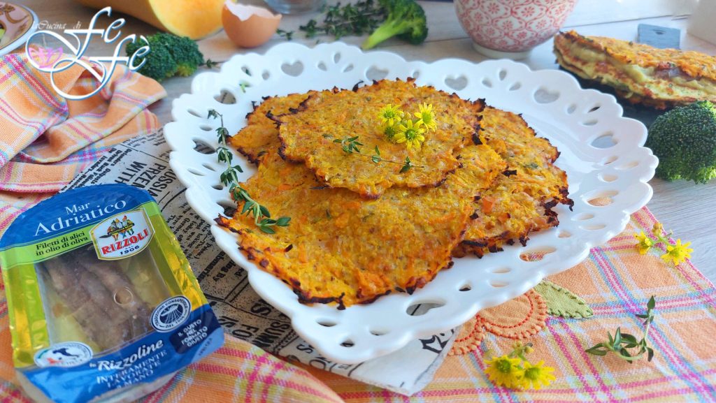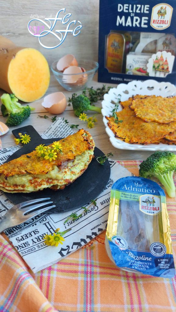 Há alguns meses, vocês devem se lembrar das minhas deliciosas tortillas de abobrinha, que preparei para um almoço casual, recheando-as com queijo cottage, pimentões assados e rúcula. Elas foram um sucesso inesperado tanto à mesa quanto nas redes sociais! E como pouco antes das festas de Natal, tive o prazer de ser escolhida pela Empresa Rizzoli Emanuelli como Taste Ambassador para os seus excelentes produtos, decidi começar a propor algumas receitinhas saborosas, testando justamente a qualidade deles! Antes de mais nada, gostaria de agradecer à Rizzoli pelo pacote recebido durante as festas, um presente muito bem-vindo e cheio de surpresas, começando pela lata “edição limitada” ilustrada e totalmente desenhada à mão; uma verdadeira peça de decoração que terei o prazer de exibir na minha cozinha. Hoje, entre os produtos deles, mostro as “Rizzoline” da linha Delizie di mare, anchovas pescadas no Mar Adriático, trabalhadas à mão e conservadas em óleo de oliva. Elas são incrivelmente saborosas, vocês precisam experimentar. Aliás, convido-os a visitar a página deles e a comprar a maletinha completa com vários produtos do mar, todos deliciosos! Mas vamos às minhas tortillas, desta vez proponho para vocês com base de cenoura e abóbora, uma versão que gostamos ainda mais do que a de abobrinha. Elas são feitas rapidamente e, devido à sua versatilidade, podem ser recheadas como quiserem. Eu as recheei com uma omelete de brócolis, algumas colheradas da minha mítica e inseparável maionese veg de folhas de couve-flor e, por último, algumas anchovas em óleo para dar um toque a mais de sabor! Serão perfeitas para preparar no dia anterior e depois rechear como se fossem sanduíches, mas a beleza é que serão mais saudáveis e leves que o pão! Serão ótimas também como petisco em um buffet de aperitivos ou como prato único para saborear no escritório ou em um passeio ao ar livre!