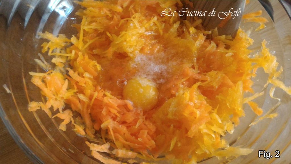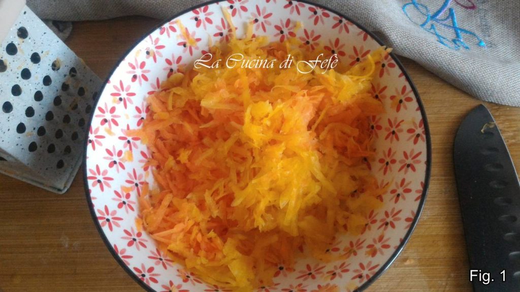 Comece ralando tanto as cenouras quanto a abóbora com um ralador de buracos grandes, colocado dentro de uma tigela grande (fig. 1).