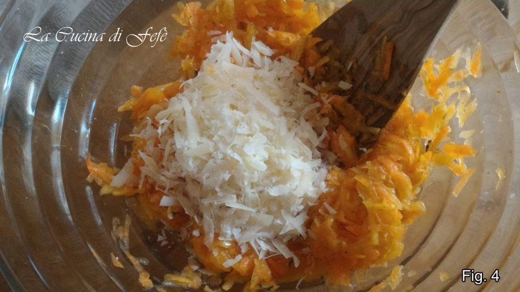 Misture com um concha e adicione o queijo ralado (fig. 4). Finalmente, adicione 2-3 colheres de sopa de farinha de rosca para dar consistência às tortillas e misture tudo (fig. 5).