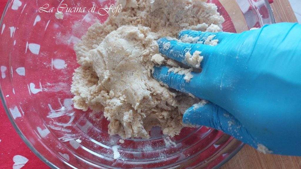 • Faça um buraco no meio e adicione a manteiga fria em pedaços. Trabalhe rapidamente até obter uma mistura que pareça areia.