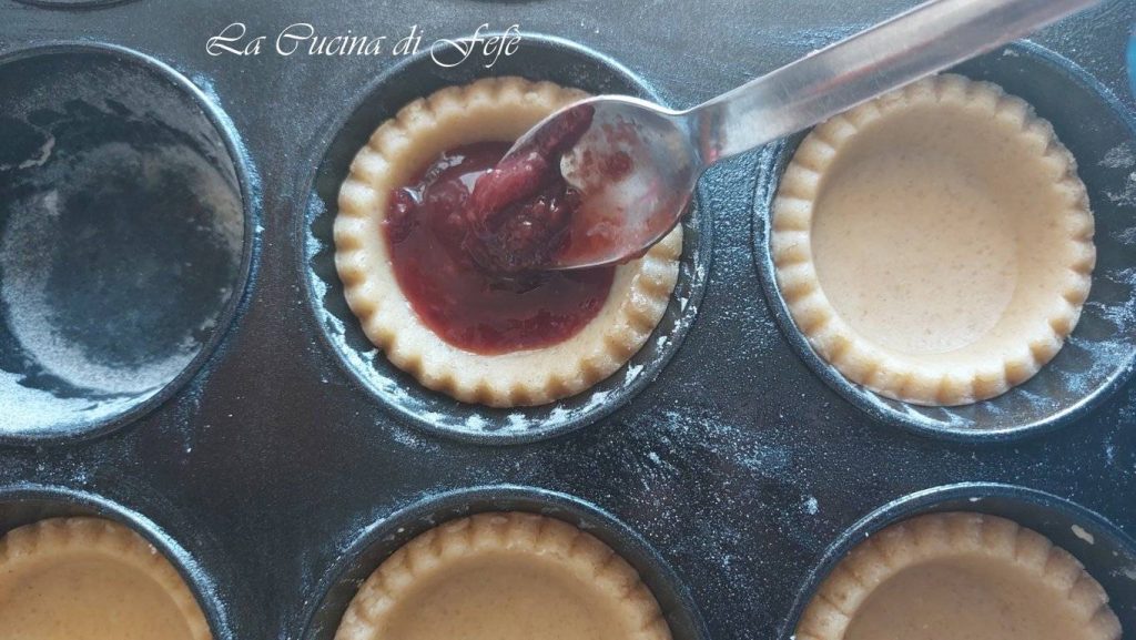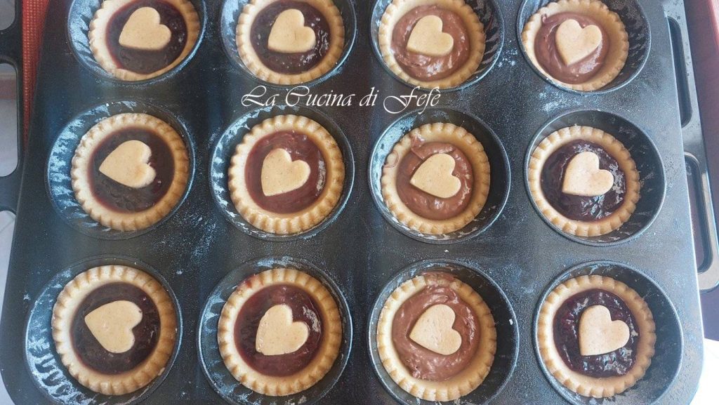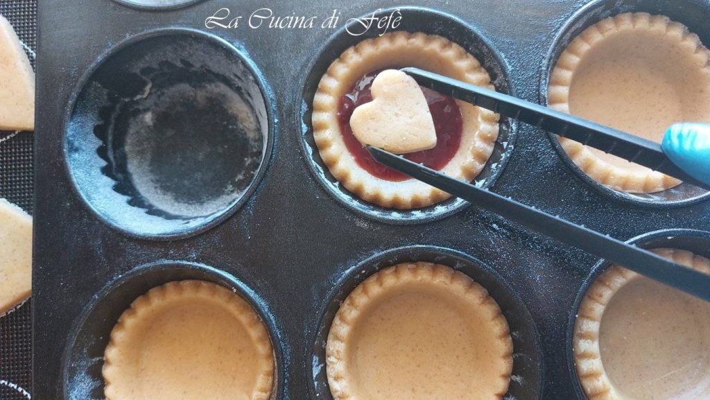 A protagonista do recheio é finalmente a geleia de framboesa. Sua nota ácida equilibra perfeitamente a doçura da massa. Para tornar essas tortinhas realmente especiais, adicionei um coração de massa no centro antes de assar: um detalhe cênico que conquistará os olhos de quem você ama antes mesmo do paladar.