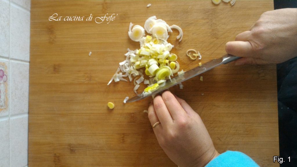 Para preparar os triangolinhos de massa filo, comece a preparar os legumes. Pique a cebolinha bem finamente, incluindo a parte mais verde (fig. 1).