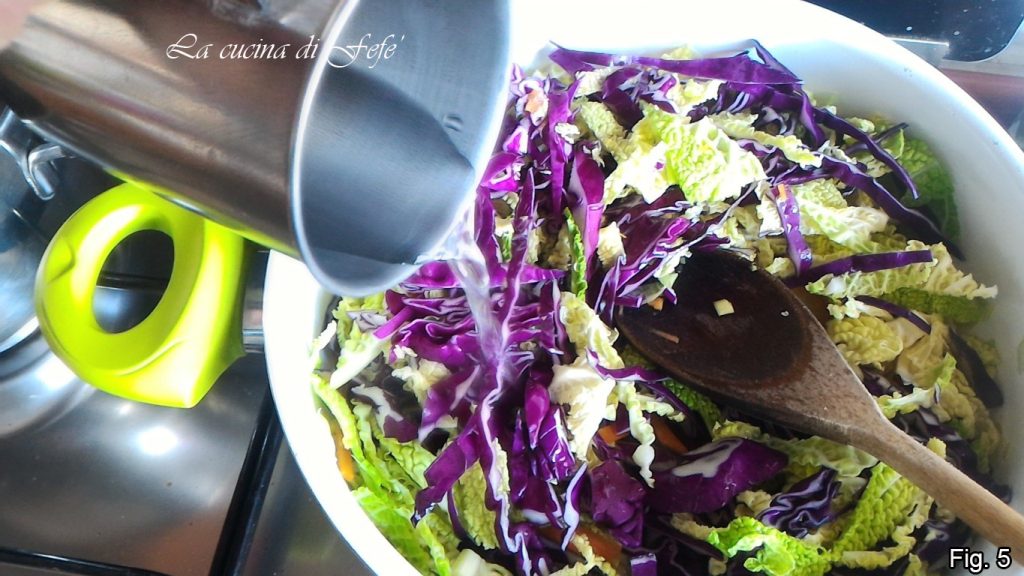 Finalmente, adicione o repolho verde e o repolho roxo, deixe apurar mais alguns minutos, então adicione mais 2-3 conchas de água quente (fig. 5).
