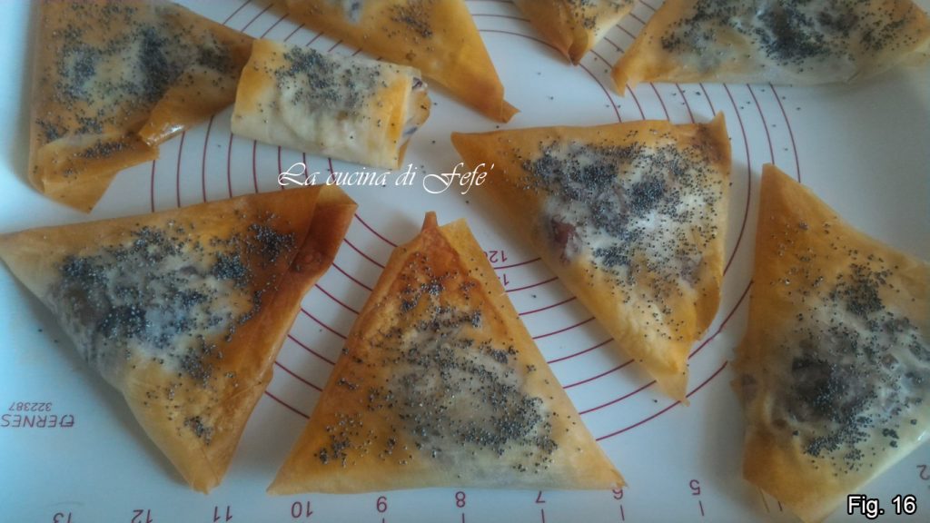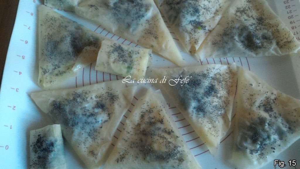 Uma vez fechado, pincele a superfície de cada triângulo com um pouco de óleo e decore a superfície com sementes de papoula (fig. 14).