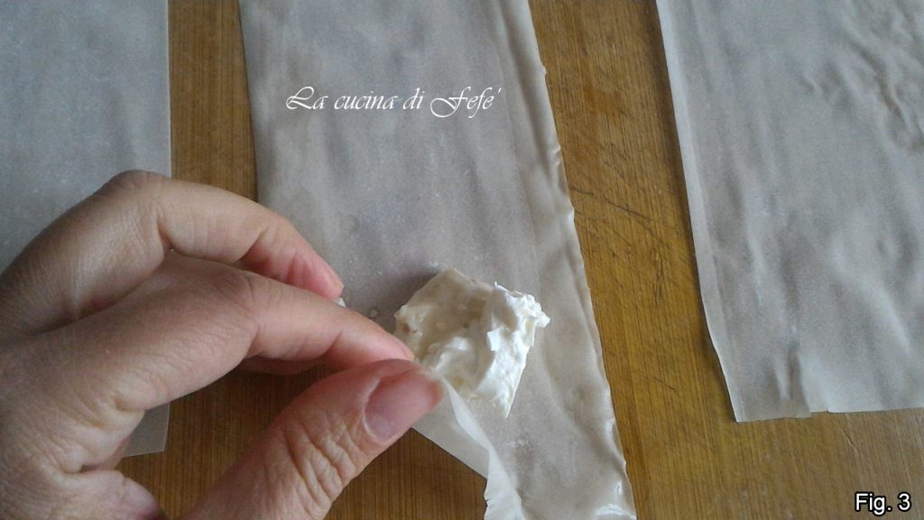 Pegue 3 folhas de massa filo e, com a ajuda de um cortador, divida-as ao meio do lado mais comprido, depois divida cada metade em outras duas, até obter 4 retângulos de 23×9 aprox., num total de 12 retângulos (fig. 1).