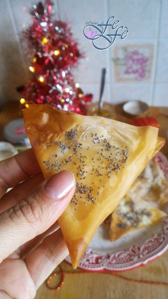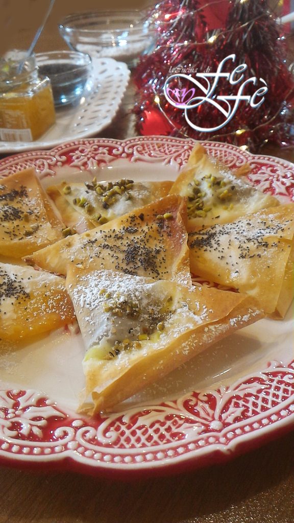 Procurando uma sobremesa para as festas de Natal, pouco exigente, mas super cenográfica e original? Os triângulos de massa filo são para você! São preparados em poucos minutos e farão sucesso porque são uma verdadeira tentação a cada mordida! A crocância da casca envolve um recheio macio e saboroso, com dupla textura, a levemente ácida da compota de tangerina, com a envolvente do mascarpone e iogurte! Tudo isso enriquecido por doces e preciosas pérolas aromáticas e perfumadas dadas pelas sementes de papoula! A escolha das minhas marmeladas e compotas, por uma óbvia afiliação territorial, é confiada a algumas empresas sicilianas que cuidam de produtos e matérias-primas de excelência. Dada a qualidade, o resultado foi realmente excelente! Aqui em casa foram devorados rapidamente como sobremesa de fim de refeição acompanhados de um café ou um bom licor. Além disso, com a massa filo, você pode realmente se soltar e fazer uma infinidade de variações para experimentar!