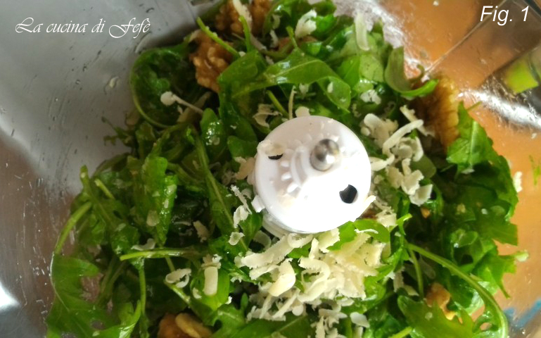 • Coloque uma panela com bastante água salgada para ferver para as trofie; enquanto isso, prepare o pesto de rúcula, lavando bem as folhas e escolhendo as mais jovens e tenras para conservar frescas para a decoração. Passe a parte restante no mixer com as nozes, uma pitada de sal, 2 cm de gengibre ralado, o parmesão e o azeite (fig. 1).