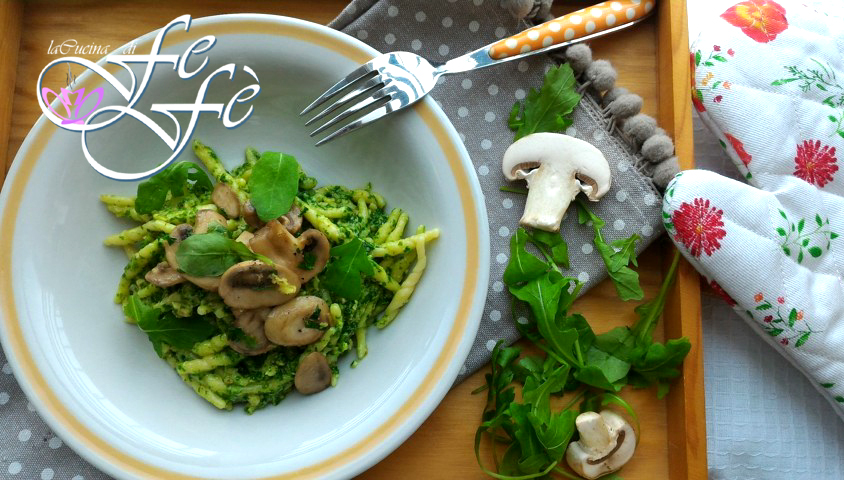 TROFIE COM PESTO DE RÚCULA E GENGIBRE COM COGUMELOS CHAMPIGNON