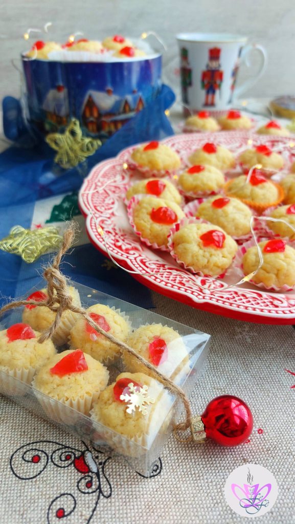 Decore cada biscoito com cerejas cristalizadas cortadas em pequenos pedaços. Coloque no forno pré-aquecido e asse a 180°C por 15′. Como o tempo varia de forno para forno, recomendo deixá-los no forno até que estejam levemente dourados.