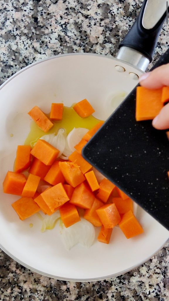 Adicione a cebola, a abóbora e uma pitada de sal. Deixe a abóbora cozinhar em fogo médio por 12-14 minutos, mexendo sempre com uma colher de pau.