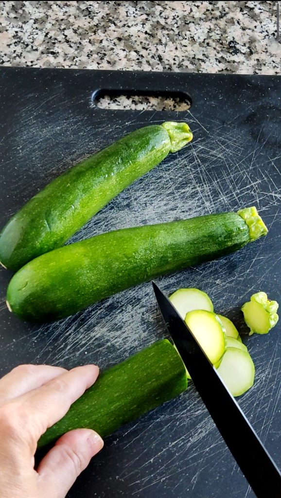 Lave as abobrinhas, corte as extremidades e com a ajuda de uma mandolina ou simplesmente com uma faca, corte-as em fatias finas.